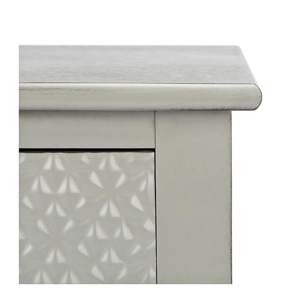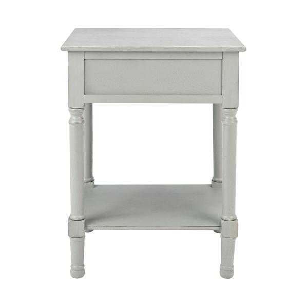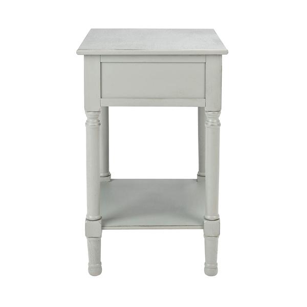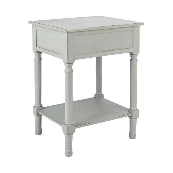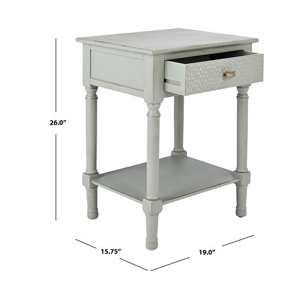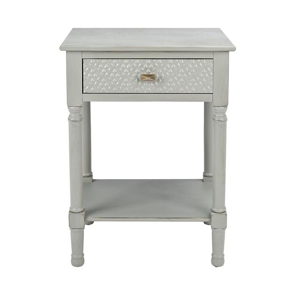 Our Evelina Gray Textured Single Drawer Accent Table will add style and storage to your living room! Hide away the remote and extra items inside the textured pull out drawer. Accent table measures 19L x 15.8W x 26H in. Crafted of wood Gray finish Turned leg design Features one (1) bottom shelf and one (1) textured pull out drawer Weight: 17.6 lbs. Weight capacity: 40 lbs. Assembly required Not intended for commercial use Care: Dust with a soft, dry cloth. This item is available at Kirklands.com only, not available in stores. Please note: this item cannot be shipped to APO/FPO addresses. WARNING: This product can expose you to chemicals including wood dust which is known to the state of California to cause cancer and birth defects or other reproductive harm. For more information go to www.P65Warnings.ca.gov.