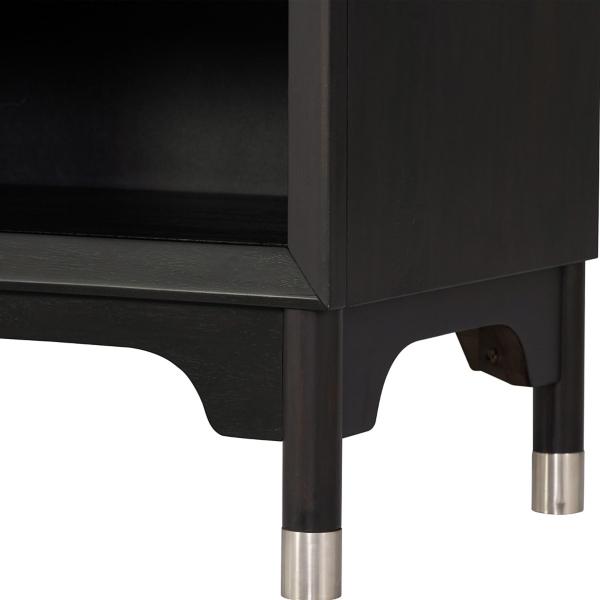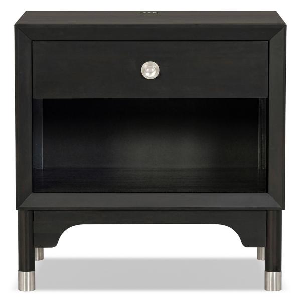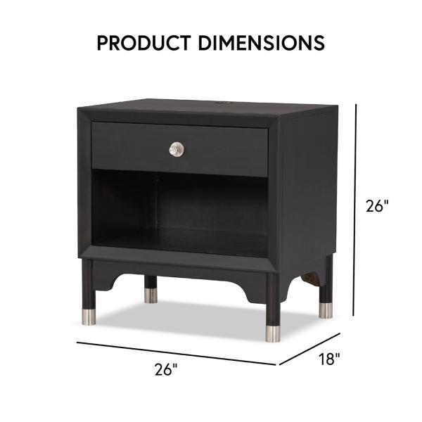 This Forma Black Charging Nightstand with LED Light features style and function! Its drawer, open shelf, touch LED light, and USB ports bring modern function all in a compact, stylish design. Nightstand measures 26W x 18D x 26H in. Crafted of rubberwood Black finish Features a drawer and an open shelf Equipped with USB charging ports and a touch LED light Silver hardware finish Weight: 50 lbs. Weight capacity: 50 lbs. Assembly required; see Info & Guides in the drop down below to view or print assembly info Not intended for commercial use Care: Wipe with a soft, dry cloth. This item is available at Kirklands.com only, not available in stores. Please note: this item cannot be shipped to APO/FPO addresses.
