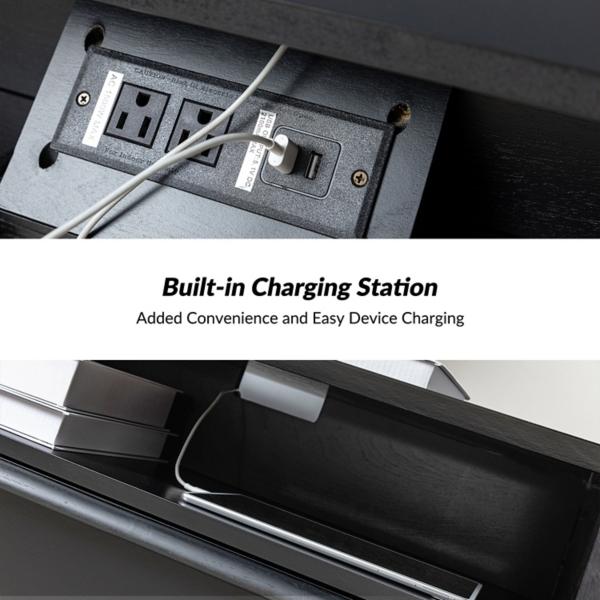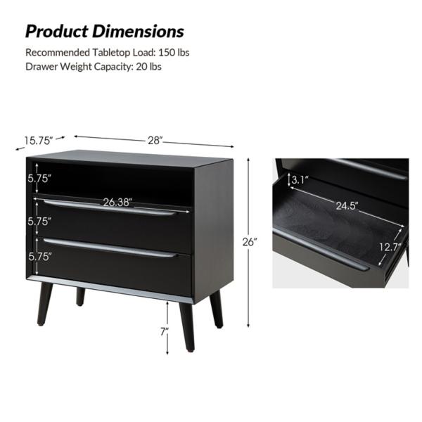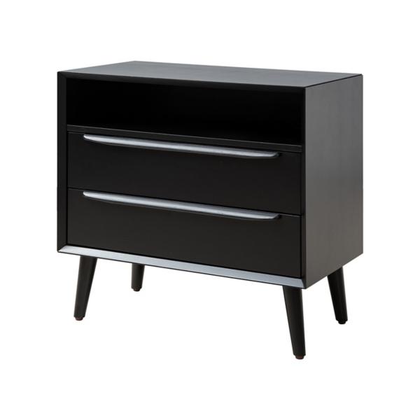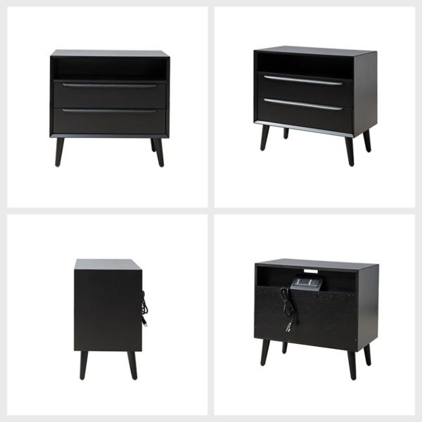 Bring mid-century modern charm to your bedroom with this Frieda Black Wood 2 Drawer Nightstand! Featuring a minimalist silhouette, built-in charging ports, and plenty of storage space, this nightstand is the perfect blend of form and function. Nightstand measures 28W x 15.75D x 26H in. Crafted of solid wood and manufactured wood Black finish Features two (2) drawers and one (1) open shelf Integrated charging station Tapered legs Weight: 56 lbs. Assembly required Not intended for commercial use Care: Wipe with a soft, dry cloth. This item is available at Kirklands.com only, not available in stores. Please note: this item cannot be shipped to APO/FPO addresses.