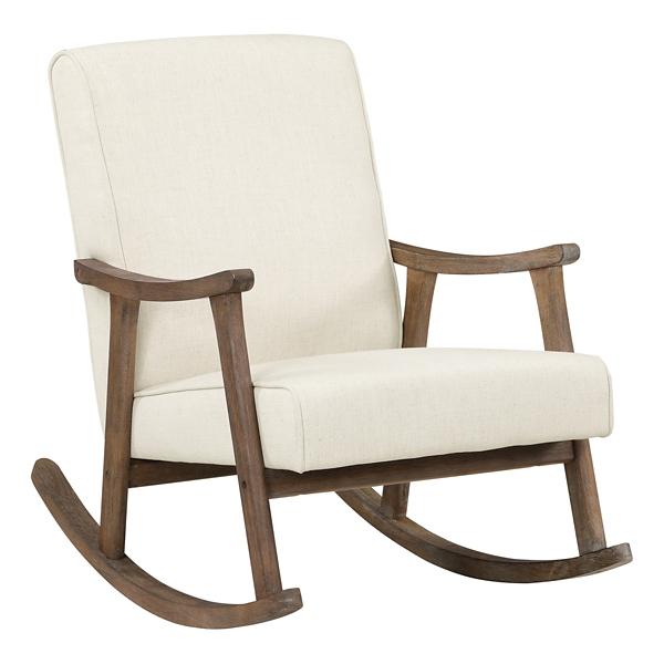 Add some classic comfort to your home with this Gainsborough Ivory Upholstered Rocking Chair. Featuring a mid-century modern look and soothing, rocking design, this chair is perfect for unwinding with a good book! Chair measures 35.25L x 25W x 31.75H in.; seat measures 17.25H in. Crafted with a solid wood and plywood frame Upholstered in ivory fabric Padded seat and back Brown frame finish Rocking chair design Curved armrest for added comfort and support Weight capacity: 250 lbs. Assembly required Not intended for commercial use Care: Spot clean using a dry cloth and the foam from a water-based cleaning agent. This item is available at Kirklands.com only, not available in stores. Please note: this item cannot be shipped to APO/FPO addresses. WARNING: This product can expose you to chemicals including toluene, which are known to the state of California to cause cancer and birth defects or other reproductive harm. For more information go to www.P65Warnings.ca.gov.