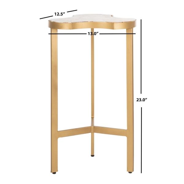 This Gold Abstract Agate Accent Table is a glamorous, contemporary addition to your space! Its shining gold tripod base shimmers beneath a sophisticated white agate top, making it an elegant focal point in any home. Table measures 13W x 12.5D x 23H in. Crafted of metal Gold finish Features an agate tabletop Tripod base Weight: 12 lbs. Weight capacity: 50 lbs. No assembly required Not intended for commercial use Care: Wipe with a soft, dry cloth. This item is available at Kirklands.com only, not available in stores. Please note: this item cannot be shipped to APO/FPO addresses.