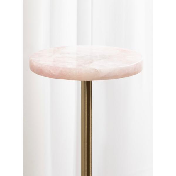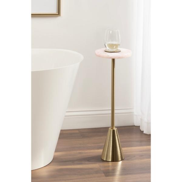 Our Gold and Natural Quartz Accent Table brings refinement and sophistication to your home with its premium design. You will come to adore the unrefined yet dazzling look of this table's pink quartz. Accent table measures 23H x 7.5 in. in diameter Crafted of quartz stone, manufactured wood, and metal Pink quartz top finish Gold metal base finish Round tabletop Weight: 7.22 lbs. Weight capacity for top: 7 lbs. Rubber pads attached to base to protect hard surfaces Assembly required Not intended for commercial use Care: Dust with a soft, dry cloth. This item is available at Kirklands.com only, not available in stores. Please note: this item cannot be shipped to APO/FPO addresses. WARNING: Cancer and Reproductive Harm - For more information go to www.P65Warnings.ca.gov.