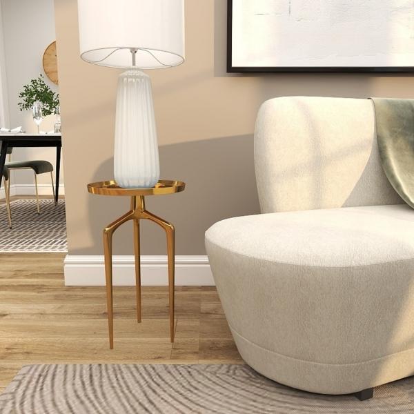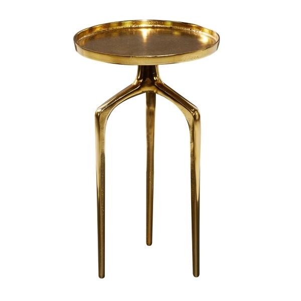 Add a chic accent to your space with this Gold Metal Round Tripod Accent Table! The stylish gold finish and eye-catching tripod design will bring a modern touch to your living room. Accent table measures 22H x 13 in. in diameter Crafted of metal Gold finish Features a tripod design Raised edges Weight: 7.02 lbs. Weight capacity: 50 lbs. No assembly required Not intended for commercial use Care: Dust with a soft, dry cloth. This item is available at Kirklands.com only, not available in stores. Please note: this item cannot be shipped to APO/FPO addresses.