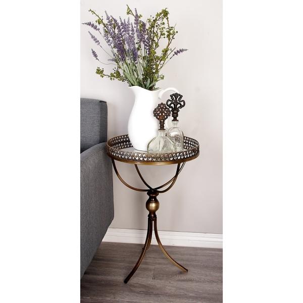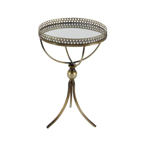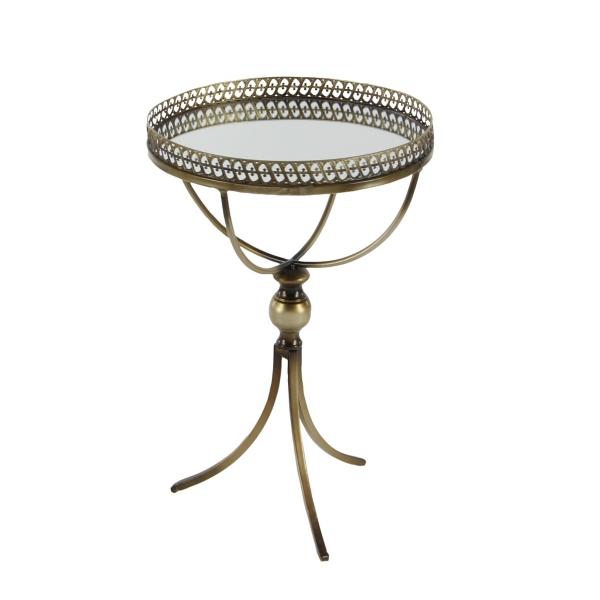 This Gold Mirror Top Metal Accent Table will look perfect next to your sofa or chair. Its gold finish and vintage-inspired style gives it a classic element. Plus, its mirror top makes it one-of-a-kind. Table measures 16L x 16W x 24H in. Crafted of iron and glass Gold finish Round tabletop with mirror inlay Tripod base design Features ornate trim around top Weight capacity: 100 lbs. Some assembly required Not intended for commercial use Care: Dust with a soft, dry cloth. This item is available at Kirklands.com only, not available in stores. Please note: this item cannot be shipped to APO/FPO addresses.
