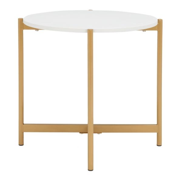 Give your space a glamorous feel with this Gold Round Gertrude Accent Table! The epitome of modern style, its gold crossed base and faux white marble top create a lavish look in any room, and its low-slung profile makes it ideal for smaller interiors. Accent table measures 19.7H x 19.7 in. in diameter Crafted of mahogany wood and MDF Gold finish Round shape Features a white faux marble epoxy tabletop Weight: 10 lbs. Assembly required Not intended for commercial use Care: Wipe with a soft, dry cloth. This item is available at Kirklands.com only, not available in stores. Please note: this item cannot be shipped to APO/FPO addresses.