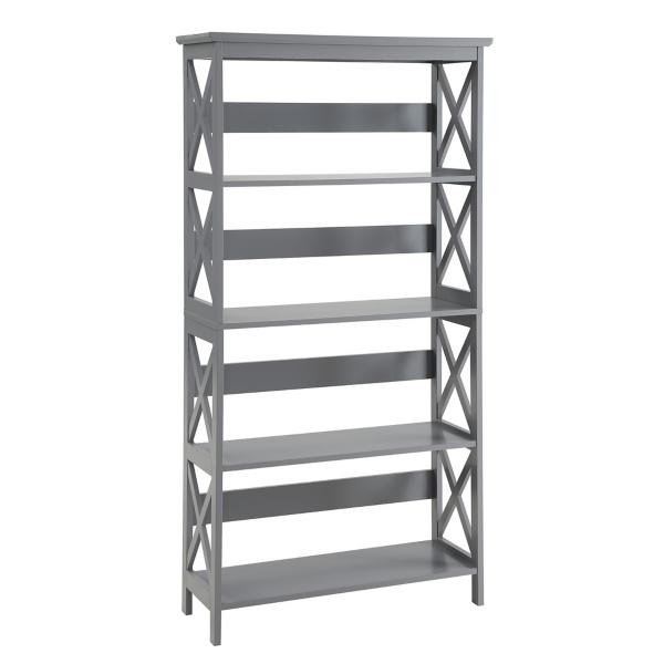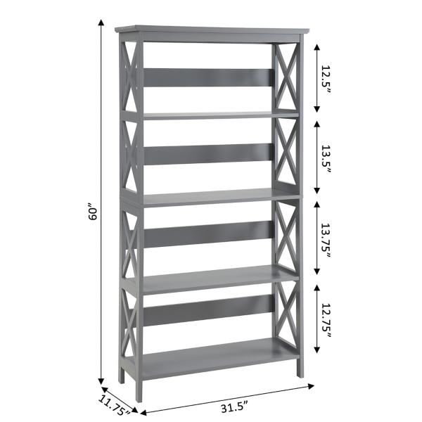 Add a modern touch to your storage with this Gray 5-Tier Oxford Bookcase! Designed with both style and function in mind, this five-tier shelving unit is perfect for showcasing your favorite books, décor, and storage essentials. Bookcase measures 31.5W x 11.75D x 60H in. Crafted of MDF Light gray finish Features five (5) tiers of shelving X design on sides Weight: 40 lbs. Weight capacity: 15 lbs. per shelf Assembly required Not intended for commercial use Care: Wipe with a soft, dry cloth. This item is available at Kirklands.com only, not available in stores. Please note: this item cannot be shipped to APO/FPO addresses.