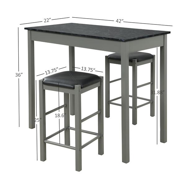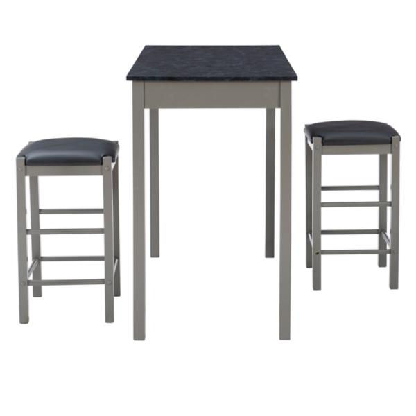 Don’t have the space or need for a big dining room table? This Gray and Black 3-pc. Stool and Table Set is ideal for dining in smaller spaces. You’ll love how its modern style elevates your home! Set includes one (1) table and two (2) stools Table measures 42L x 22W x 36H in. Stools measure 13.75L x 13.75W x 25H in. Crafted with a wood and wood composite frame Gray frame finish Black, faux stone tabletop finish Stools upholstered in black faux leather fabric Weight capacity: 225 lbs. Assembly required Not intended for commercial use Care: Dust with a soft, dry cloth. This item is available at Kirklands.com only, not available in stores. Please note: this item cannot be shipped to APO/FPO addresses.