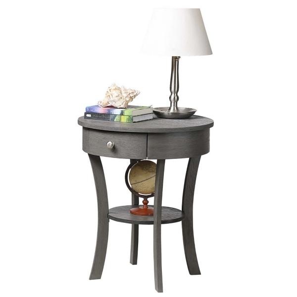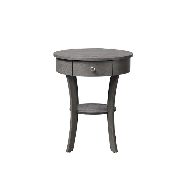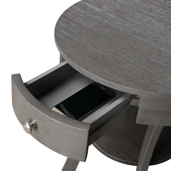 Incorporate stylish storage into your space with this Gray Curved Legs Round Drawer Accent Table! This sleek accent table has a drawer for storage and a lower shelf for displaying your favorite home decor. Accent table measures 24H x 20 in. in diameter Crafted of solid rubberwood, manufactured wood, and veneer White finish Round shape Features one (1) drawer and one (1) lower shelf Silver hardware finish Curved leg design Weight: 19 lbs. Weight capacity: 40 lbs. Assembly required Not intended for commercial use Care: Wipe with a soft, dry cloth. This item is available at Kirklands.com only, not available in stores. Please note: this item cannot be shipped to APO/FPO addresses.