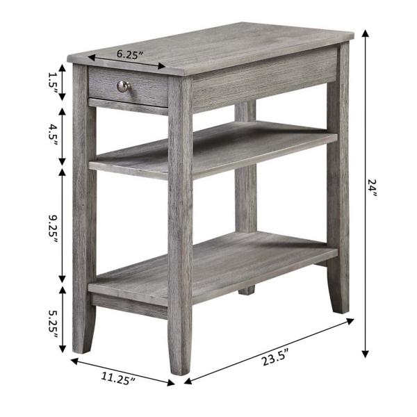 With a sturdy construction and a classically simple design, this Gray Double Shelf Wood Accent Table will be the perfect addition to your living room or bedroom. Plus, with two shelves and a drawer, it provides ample storage space! Table measures 11.25L x 23.5W x 24H in. Crafted of solid rubberwood Gray finish Features one (1) drawer and two (2) shelves Nickel drawer handle finish Weight: 20 lbs. Shelf weight capacity: 20 lbs. Assembly required Not intended for commercial use Care: Dust with a soft, dry cloth. This item is available at Kirklands.com only, not available in stores. Please note: this item cannot be shipped to APO/FPO addresses.