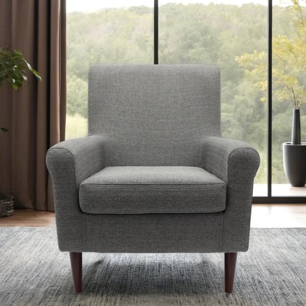 Take a seat in classic yet contemporary style! The Gray Ellen Rolled Arms Accent Chair features a comfortable, neutral design that'll make any space feel effortlessly put-together. Chair measures 30L x 28W x 35H in.; seat measures 19H in. Crafted of polyester and wood High-density foam fill Upholstered in a gray polyester Brown leg finish Padded, removable seat Crafted with sustainable materials Weight capacity: 300 lbs. Some assembly required Made in the United States Not intended for commercial use Care: Dust with a soft, dry cloth. This item is available at Kirklands.com only, not available in stores. Please note: this item cannot be shipped to APO/FPO addresses.