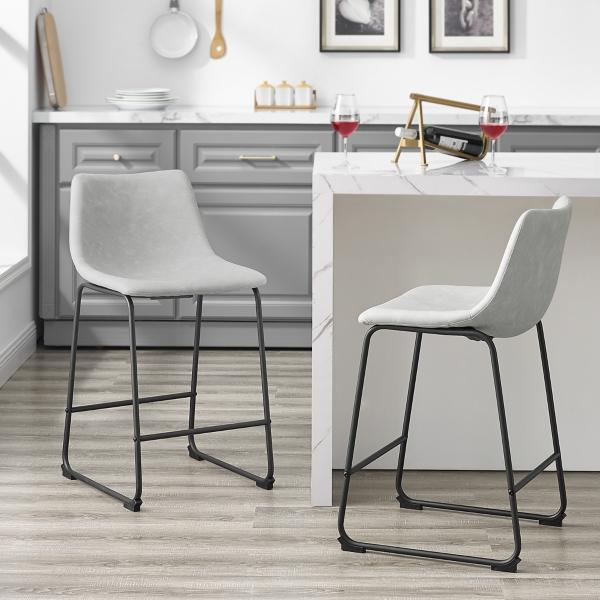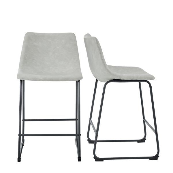 Dine in style with our stunning set of Gray Faux Leather Counter Stools. Modern and traditional styles come together beautifully in these dining chairs. Set includes two (2) counter stools Each counter stool measures 21L x 15W x 40H in. Crafted of faux leather and metal Gray finish Features curved and comfortable seat Industrial style design Weight: 36 lbs. Full assembly required Not intended for commercial use Care: Dust with a soft, dry cloth. This item is available at Kirklands.com only, not available in stores. Please note: this item cannot be shipped to APO/FPO addresses. WARNING: Cancer and Reproductive Harm - For more information go to www.P65Warnings.ca.gov.