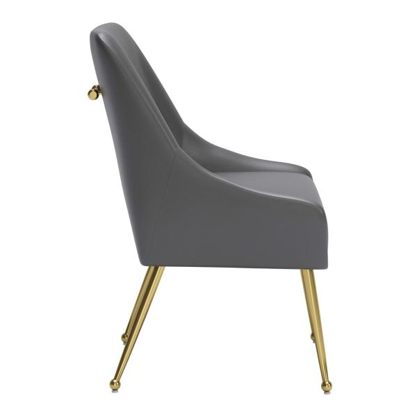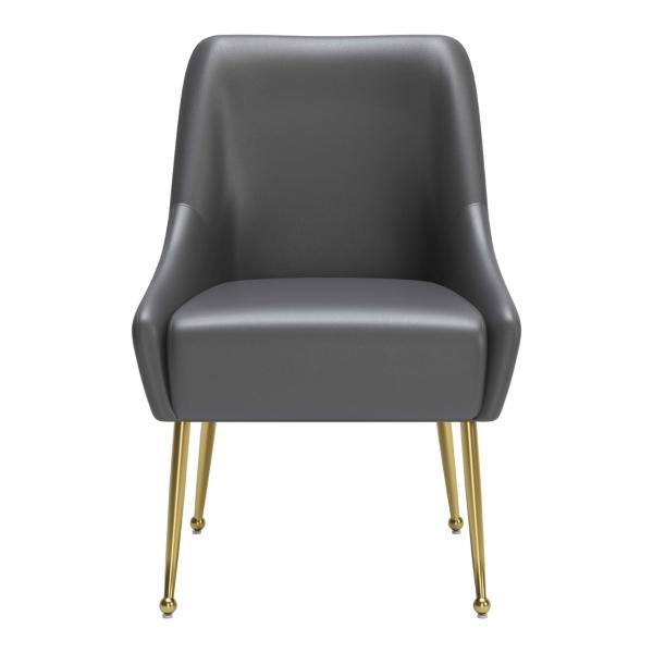 Elevate your dining space with this Gray Faux Leather Max Dining Chair! This dining chair chair features a sleek, curved silhouette upholstered in smooth gray faux leather, offering a sophisticated look that complements any home. Chair measures 22.8W x 23.6D x 32.7H in.; seat height: 18.1 in. Crafted with a wood frame and metal legs Upholstered in gray faux leather and filled with high-density foam Gold metal leg finish Features a backrest handle for easy gripping Rubber feet protect floor from scratches Weight: 18.3 lbs. Weight capacity: 330 lbs. Assembly required; see "Info & Guides" in the drop down below to view or print assembly info Not intended for commercial use Care: Wipe with a soft, dry cloth. This item is available at Kirklands.com only, not available in stores. Please note: this item cannot be shipped to APO/FPO addresses.