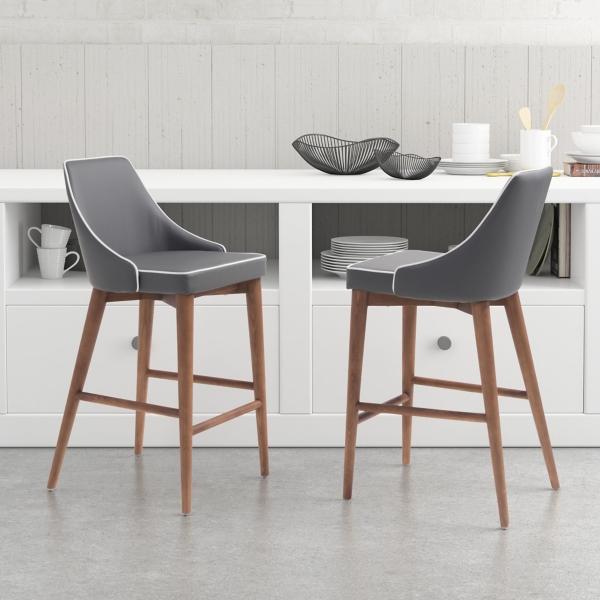 Refresh your kitchen with this Gray Faux Leather Moore Counter Stool! This sleek stool will elevate your counter space with a modern touch. Its comfortable construction makes it ideal for everyday use! Counter stool measures 18W x 19.7D x 37H in.; seat height: 26 in. Crafted with a manufactured wood frame Upholstered in 100% polyurethane with high-density foam fill Walnut wood finish Gray faux leather upholstery finish Features a wingback design Accented with white trim Plush and durable faux leather fabric Built-in footrest Rubber feet protect floor from scratches Weight: 17.8 lbs. Weight capacity: 250 lbs. Assembly required Not intended for commercial use Care: Clean with non-water based vinyl or leather cleaner only. This item is available at Kirklands.com only, not available in stores. Please note: this item cannot be shipped to APO/FPO addresses.
