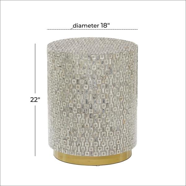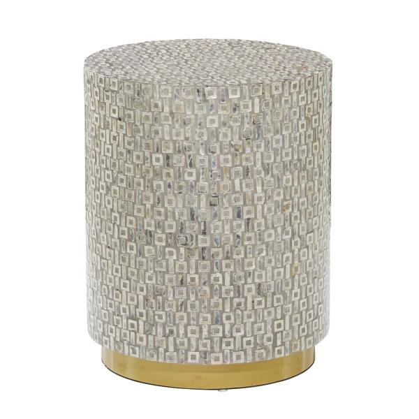 Our Gray Mother Of Pearl Sells Wood Base Accent Table brings sophistication and style to any space. You'll love having this stunning accent table in your home. Table measures 17.85L x 17.85W x 22.5H in. Crafted of wood and shells Gray finish Drum shape Gold base finish Weight: 20 lbs. Some assembly required Not intended for commercial use Care: Dust with a soft, dry cloth. This item is available at Kirklands.com only, not available in stores. Please note: this item cannot be shipped to APO/FPO addresses.