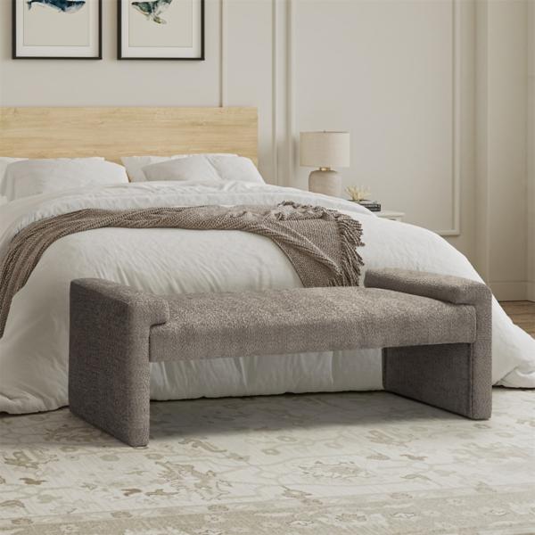 This Gray Severin Upholstered Bench is perfect for incorporating additional seating into any space! It's modern design and soft, textured upholstery is ideal for your living room, bedroom, or entryway. Bench measures 58.5W x 17D x 20H in. Crafted with a wood frame Upholstered in gray polyester and filled with high-density foam Features an outrigger design with arm trays Seat measures 45W x 17D x 18H in. Weight: 34 lbs. Weight capacity: 250 lbs. Assembly required Not intended for commercial use Care: Spot clean. This item is available at Kirklands.com only, not available in stores. Please note: this item cannot be shipped to APO/FPO addresses.