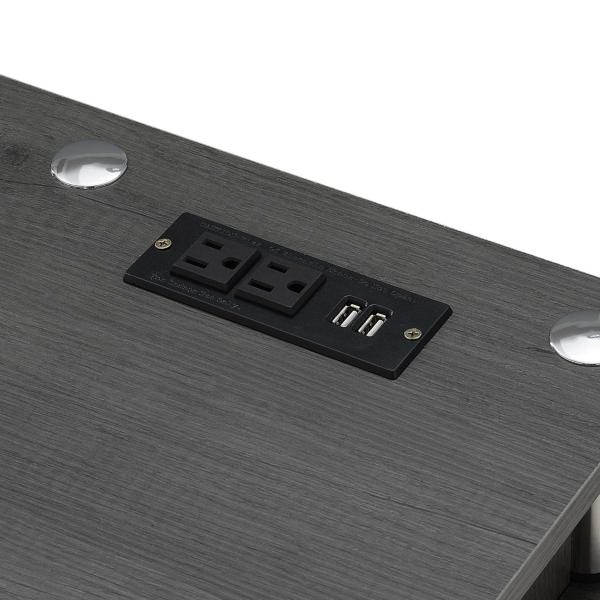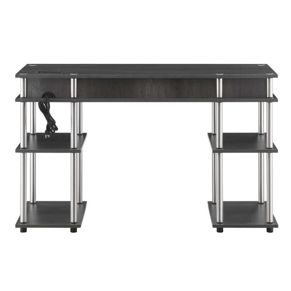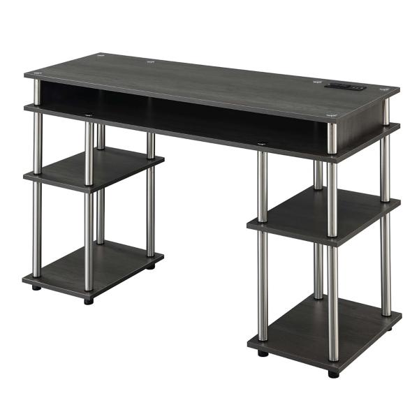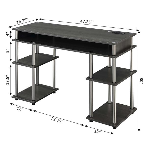 Create a sleek workspace with this Gray Storage Desk with Charging Station! Featuring a spacious tabletop, three-tier shelving, and a charging port, this desk offers ample room for your laptop, writing materials, and daily essentials. Desk measures 47.25W x 15.75D x 30H in. Crafted of MDF and stainless steel Gray finish Features five (5) open shelves Tabletop charging station with two (2) standard outlets and two (2) USB ports Includes 6 ft. long power supply cord Weight: 40 lbs. Weight capacity: 50 lbs. (top); 20 lbs. (per shelf) Assembly required; no tools needed Not intended for commercial use Care: Wipe with a soft, dry cloth. This item is available at Kirklands.com only, not available in stores. Please note: this item cannot be shipped to APO/FPO addresses.