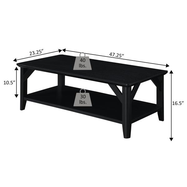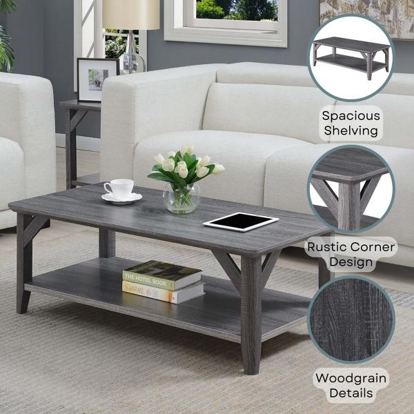 Add a farmhouse-style touch to your home with this Gray Tapered Legs Rustic Coffee Table! You’ll love the rustic details and lower shelf for added storage. Coffee table measures 47.25W x 23.25D x 16.5H in. Crafted of MDF hollow core and finished with detailed woodgrain melamine Gray finish Features one lower shelf Accented with tapered legs and rustic details Includes optional protective foot tacks to protect hardwood floors Weight: 33 lbs. Weight capacity: 40 lbs. Easy assembly required Not intended for commercial use Care: Wipe with a soft, dry cloth. This item is available at Kirklands.com only, not available in stores. Please note: this item cannot be shipped to APO/FPO addresses.