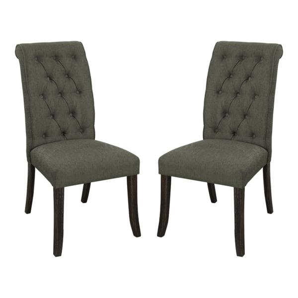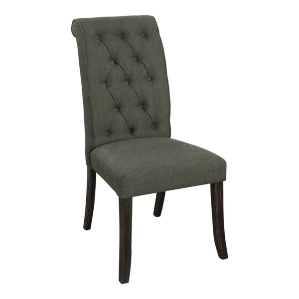 Elevate your kitchen with these Gray Tufted Landon Dining Chairs! These chairs feature sophisticated details and comfortable seats to bring a stylish yet comfy feel to your home. Set includes two (2) dining chairs Each chair measures 20W x 28D x 42H in.; seat height: 19.5 in. Crafted of wood Upholstered in gray polyester with high-density foam Black finish Features rolled backs and button tufting Tapered legs Weight capacity: 250 lbs. Assembly required Not intended for commercial use Care: Spot clean. This item is available at Kirklands.com only, not available in stores. Please note: this item cannot be shipped to APO/FPO addresses.