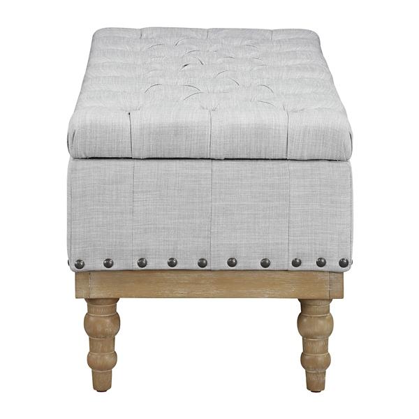 Bring a sophisticated touch to your home with this Gray Tufted Traditional Landen Storage Bench! This farmhouse-inspired bench features hidden storage space to keep your space tidy and stylish. Ottoman measures 51W x 19D x 18.5H in. Crafted with a wood frame Upholstered in polyester and filled with high-density foam Natural light wood finish Dove gray fabric finish Features interior storage space Button tufted padded top Nailhead trim detail Solid wood turned legs Weight: 18.5 lbs. Weight capacity: 300 lbs. Some assembly required; screw on legs Not intended for commercial use Care: Spot clean. This item is available at Kirklands.com only, not available in stores. Please note: this item cannot be shipped to APO/FPO addresses.