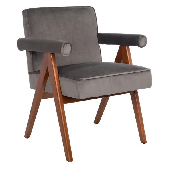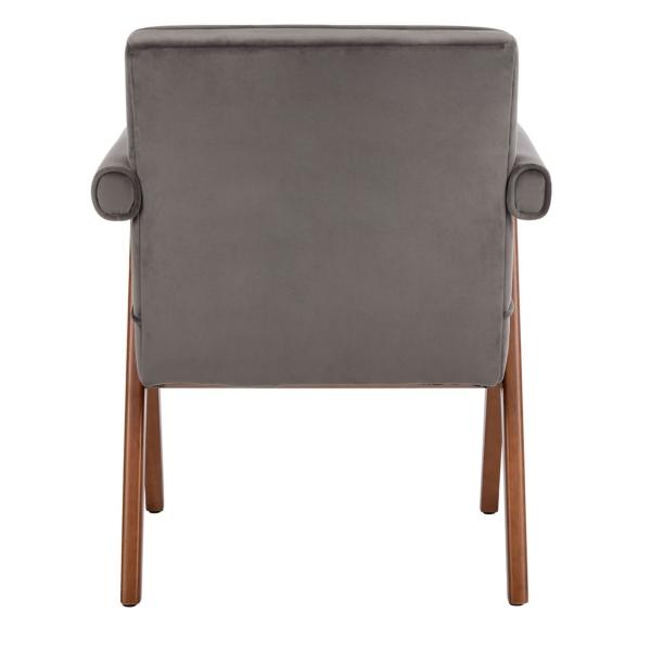 Elevate your space with this Gray Velvet Mid-Century Kate Accent Chair! This sophisticated, vintage-inspired chair features plush velvet cushions and bolster-style arms that allow you to relax in luxury. Chair measures 23.2W x 24D x 29.9H in.; seat height: 18.9 in. Crafted with a wood frame Upholstered in velvet and filled with high-density foam Walnut wood leg finish Gray upholstery finish Features an A-frame design Bolster-style armrests Weight: 19 lbs. Weight capacity: 275 lbs. No assembly required Not intended for commercial use Care: Spot clean. This item is available at Kirklands.com only, not available in stores. Please note: this item cannot be shipped to APO/FPO addresses.