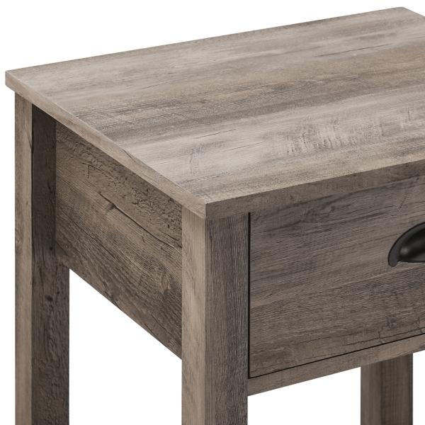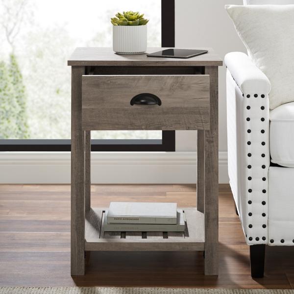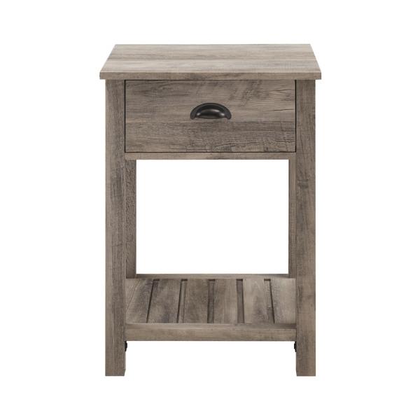 Whether you’re looking to keep things quaint and cozy or simply organize your home, this Gray Wash Country Accent Table will satisfy your design desires! The single top drawer with a cup handle features telescoping metal drawer glides for convenient closed storage. The lower slat-style shelf creates an open storage space while infusing farmhouse style. Use this accent table in the living room or home office for some sneaky storage. Pair with the matching entry table to make a complete set in your home! Table measures 18L x 15.75W x 25.25H in. Crafted of warp-resistant wood composite, high-quality laminate, and painted metal Features one (1) drawer and one (1) bottom tier for storage Gray wash finish Full assembly required Not intended for commercial use Care: Dust with a soft, dry cloth. This item is available at Kirklands.com only, not available in stores. Please note: this item cannot be shipped to APO/FPO addresses.