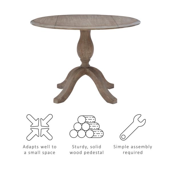 This table is the perfect place to host dinners, share meals with family, or enjoy a cup of coffee. The Gray Wash Drop Leaf Dining Table is a great choice for any stylish kitchen or dining room. Table measures 42L x 42W x 30H in. Crafted with wood Gray wash finish Pedestal design Two (2) drop leaves Maximum Weight: 100 lbs. Assembly required Not intended for commercial use Care: Dust with a soft, dry cloth. This item is available at Kirklands.com only, not available in stores. Please note: this item cannot be shipped to APO/FPO addresses. WARNING: This product can expose you to chemicals including Di-(2-ethl hexyl) phthalate which is known to the state of California to cause cancer and birth defects or other reproductive harm. For more information go to www.P65Warnings.ca.gov.