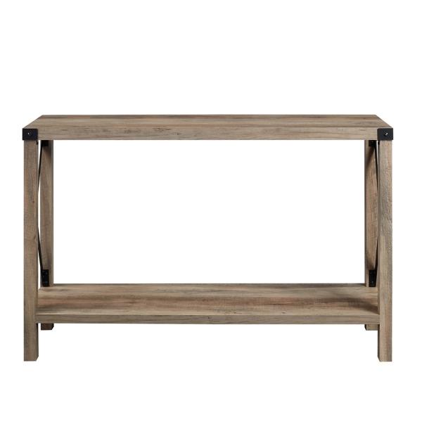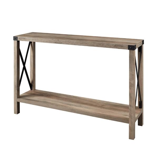 With this Gray Wash Farmhouse X-Frame Console Table, you’ll have a stylish entryway in no time! The urban-industrial and farmhouse styles create a warm and inviting feel within your home. It includes metal accents on the corners and x-shaped sides for an intriguing design. A lower shelf made from durable laminate provides a surface to decorate or a space for your shoes when you get home. Accent table measures 46L x 12W x 30H in. Crafted with laminate, metal, and warp-resistant wood composite Gray wash finish Black metal side frame finish Natural, wood grain details Metal x-shaped design on two (2) sides Bracket accents on top four (4) corners Features one (1) lower shelf for storage and display Rectangle shape Full assembly required Not intended for commercial use Care: Dust with a soft, dry cloth. This item is available at Kirklands.com only, not available in stores. Please note: this item cannot be shipped to APO/FPO addresses.