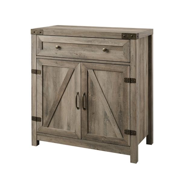 Picture your entryway transforming into a darling cottage entrance or a rustic ranch foyer with this Gray Wash Wooden and Metal Barn Door Cabinet! Complement the accent cabinet with a mirror, a painting, or some greenery. Go for a calm chateau glow or a fancy farmhouse soiree. Use the cabinet’s drawer for easy access storage for your car keys, notebooks, or phone chargers. And with adjustable shelves, this cabinet can be arranged to fit all your storage needs. Place it wherever you want a sprinkle of pastoral pleasantry, whether it’s in your living room, bedroom, home office, or entryway. Cabinet measures 30L x 15.5W x 33H in. Crafted of durable laminate, metal, and warp-resistant wood composite Gray finish Accented with antique bronze metal Features two (2) doors, one (1) drawer, and two (2) adjustable shelves Farmhouse barndoor door finish Full assembly required Not intended for commercial use Care: Dust with a soft, dry cloth. This item is available at Kirklands.com only, not available in stores. Please note: this item cannot be shipped to APO/FPO addresses.