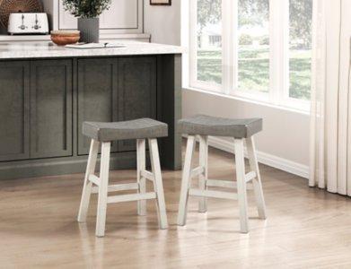 Our Gray & White Wood Counter Stool Set is perfect for your farmhouse style home! These lightly distressed transitional stools are perfect for your breakfast bar or counter. You’ll love the rustic charm of these stools! Set includes two (2) stools Each stool measures 17.5L x 15.5W x 25H in. Crafted of wood White base finish Gray seat finish Features a saddle seat and backless design Weight capacity: 250 lbs. Assembly required Not intended for commercial use Care: Wipe clean. This item is available at Kirklands.com only, not available in stores. Please note: this item cannot be shipped to APO/FPO addresses.