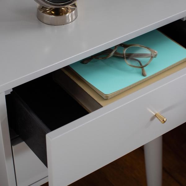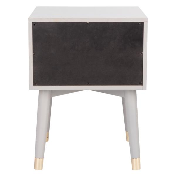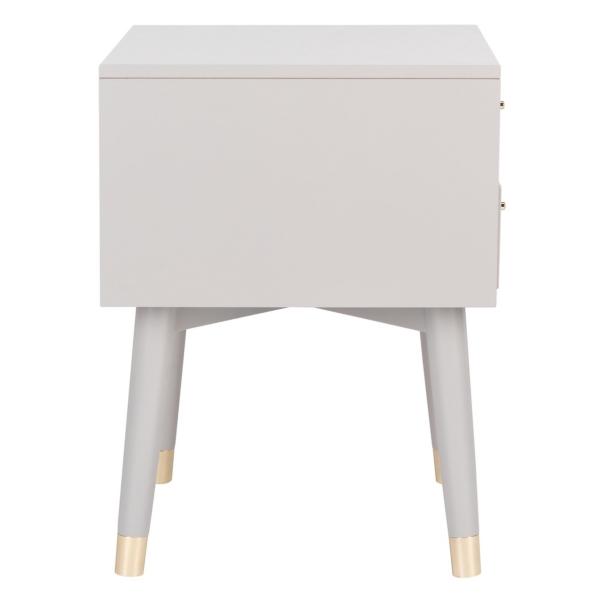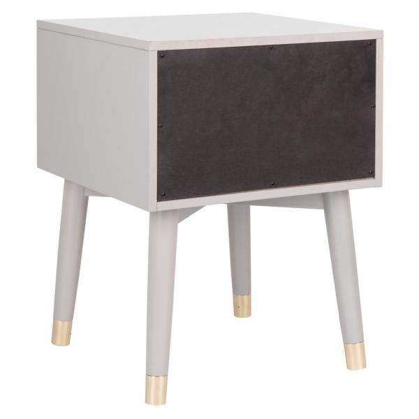 This Gray Wood 2-Drawer Katie End Table is inspired by mid-century modern designs! Its soft gray finish beautifully contrasts with the gold metallic accents, bringing instant style to any space. End table measures 18W x 18D x 24H in. Crafted of rubberwood and MDF Gray finish Features two (2) drawers Gold metal accents Drawers measure 14.2W x 12.8D x 2.6H in. Weight: 29 lbs. Weight capacity: 35 lbs. Assembly required; see Info & Guides in the drop down below to view or print assembly info Not intended for commercial use Care: Wipe with a soft, dry cloth. This item is available at Kirklands.com only, not available in stores. Please note: this item cannot be shipped to APO/FPO addresses.