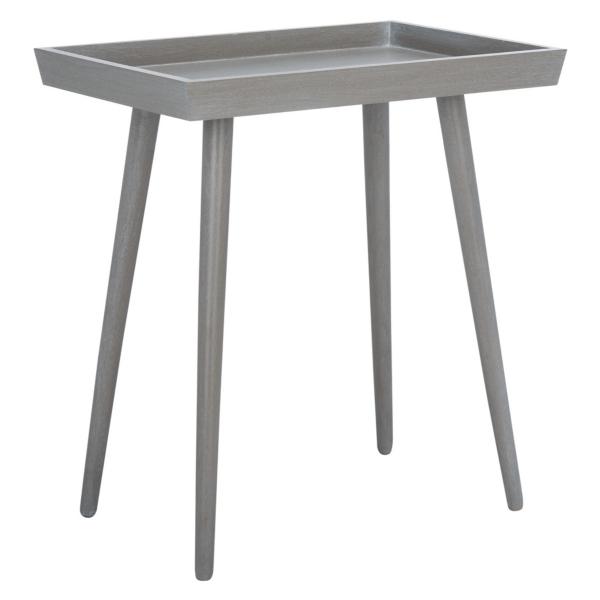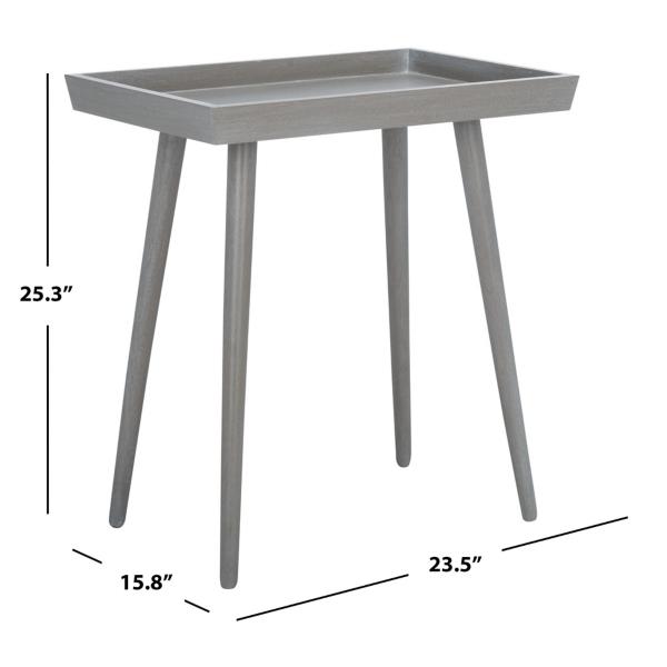 This modern Gray Wood Mina Tray End Table features a sleek design to suit any style. Crafted of wood in a slate gray finish, the raised edges provide ample space for magazines, snacks, or your morning coffee! End table measures 23.5W x 15.8D x 25.3H in. Crafted of pine wood and MDF Slate gray finish Features raised edges Angled legs Weight: 8 lbs. Weight capacity: 30 lbs. Assembly required; see Info & Guides in the drop down below to view or print assembly info Not intended for commercial use Care: Wipe with a soft, dry cloth. This item is available at Kirklands.com only, not available in stores. Please note: this item cannot be shipped to APO/FPO addresses.