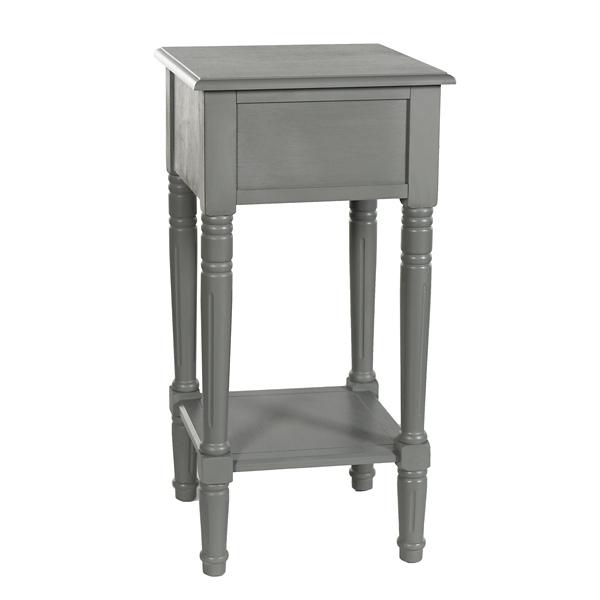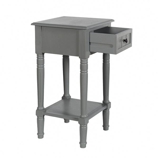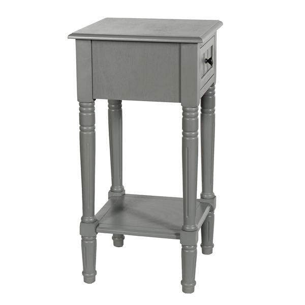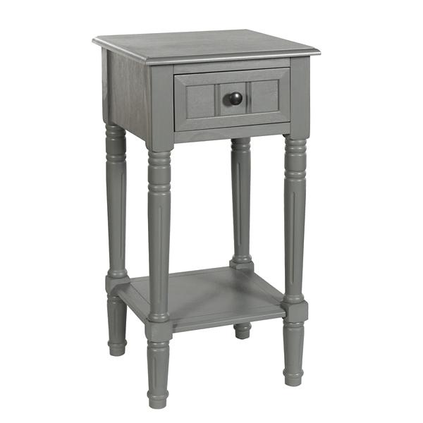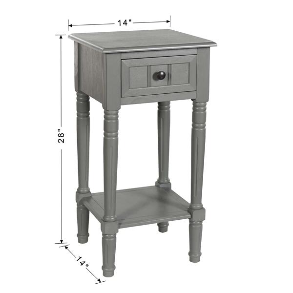 Give your space a stylish touch with this Gray Wood Square Hampton Accent Table! This end table features carved details and storage space for a functional and elegant addition to your living room. Accent table measures 14W x 14D x 28H in. Crafted of manufactured wood Gray finish Square shape Features one (1) drawer and one (1) lower shelf Accented with carved drawer and leg details Weight: 14.96 Assembly required Not intended for commercial use Care: Wipe with a soft, dry cloth. This item is available at Kirklands.com only, not available in stores. Please note: this item cannot be shipped to APO/FPO addresses.
