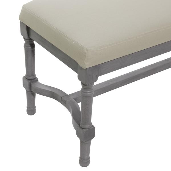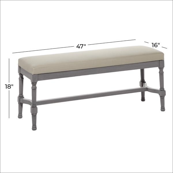 Bring traditional style and seating into your home with this Gray Wood Upholstered Burlap Seat Bench. The pillar shaped legs will add classic charm to your entryway! Bench measures 47L x 16W x 18H in. Crafted of wood and linen Gray base finish Upholstered seat in a beige linen fabric Pillar shaped legs Trestle style base Weight capacity: 400 lbs. No assembly required Not intended for commercial use Care: Spot clean only. This item is available at Kirklands.com only, not available in stores. Please note: this item cannot be shipped to APO/FPO addresses. WARNING: Cancer and Reproductive Harm - For more information go to www.P65Warnings.ca.gov.