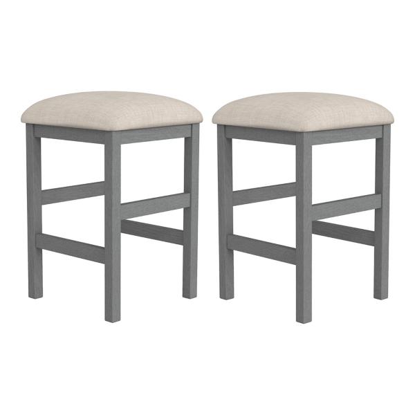 The Gray Wood Upholstered Seat 2-pc. Counter Stool Set will bring modern farmhouse character and comfort to your dining area. The padded seats and built-in footrests are perfect for perching in the kitchen! Set includes two (2) stools Stools measure 14L x 14W x 24H in. each Crafted of with acacia wood and wood veneer frames Gray wood base finish High density foam fill Upholstered in ivory polyester fabric Weight capacity: 250 lbs. each Assembly required Not intended for commercial use Care: Wipe and spot clean only. This item is available at Kirklands.com only, not available in stores. Please note: this item cannot be shipped to APO/FPO addresses. WARNING: This product can expose you to chemicals including formaldehyde (gas) which is known to the state of California to cause cancer and birth defects or other reproductive harm. For more information go to www.P65Warnings.ca.gov.