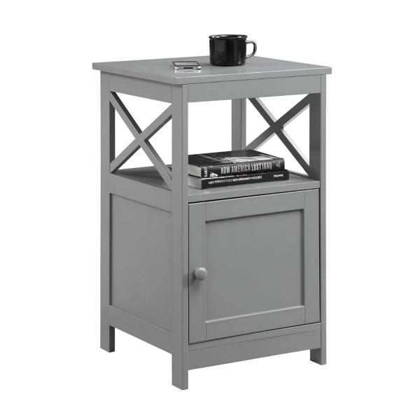 Storage and style meet with this Gray Wood X Sides Storage Accent Table! Give your space a contemporary upgrade with this convenient, functional, and durable accent table. Accent table measures 15.75W x 15.75D x 26H in. Crafted of MDF Gray finish Features two (2) tiers of shelving and one (1) cabinet Accented with X cut-outs Weight: 20 lbs. Weight capacity: 40 lbs. Easy assembly required Not intended for commercial use Care: Wipe with a soft, dry cloth. This item is available at Kirklands.com only, not available in stores. Please note: this item cannot be shipped to APO/FPO addresses.