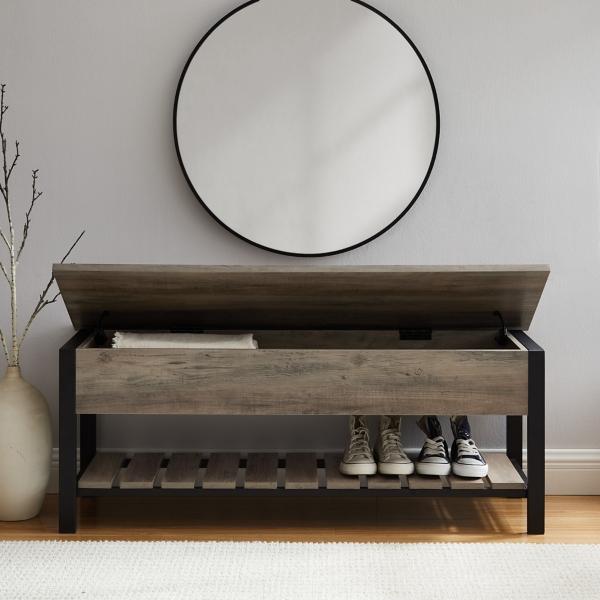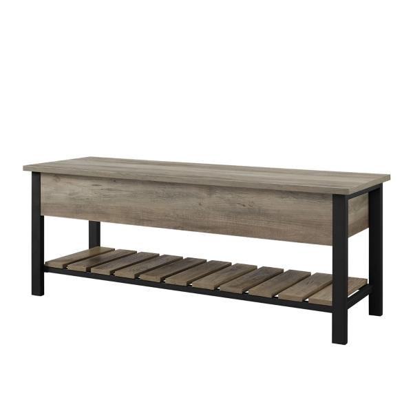 Our Graywashed Lift-Top Storage Bench is an ideal addition for any entryway. Its lower shelf is great for keeping shoes off the floor and out of the way, and its interior storage compartment is perfect for off-season storage of winter gear. Bench measures 48L x 16W x 18H in. Crafted of warp-resistant wood composite, powder-coated metal, and durable laminate Graywashed wood finish Black metal frame finish Hinged top opens to reveal interior storage Features one (1) lower open slat shelf for storage Full assembly required Not intended for commercial use Care: Dust with a soft, dry cloth. This item is available at Kirklands.com only, not available in stores. Please note: this item cannot be shipped to APO/FPO addresses.