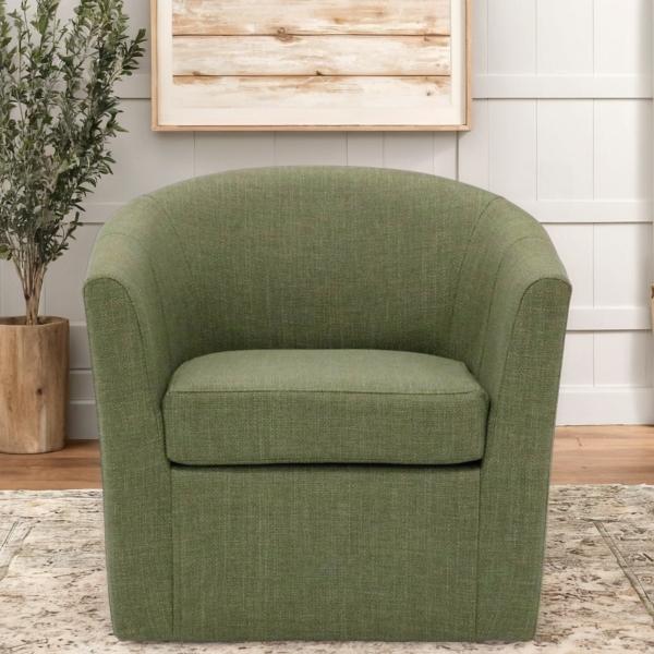 Comfort meets style with our Green Upholstered Swivel Accent Chair! Featuring a supportive back, armrests, and a thick cushion, this chair is perfect for setting up a cozy nook or relaxing den. Accent chair measures 30.5W x 27D x 30H in. Crafted with a wood and metal frame Upholstered in green polyester and filled with high-density foam Features a traditional club chair design Flared arms 360 degree swivel capability Weight: 34 lbs. Weight capacity: 300 lbs. No assembly required Made in the United States Not intended for commercial use Care: Spot clean. This item is available at Kirklands.com only, not available in stores. Please note: this item cannot be shipped to APO/FPO addresses.