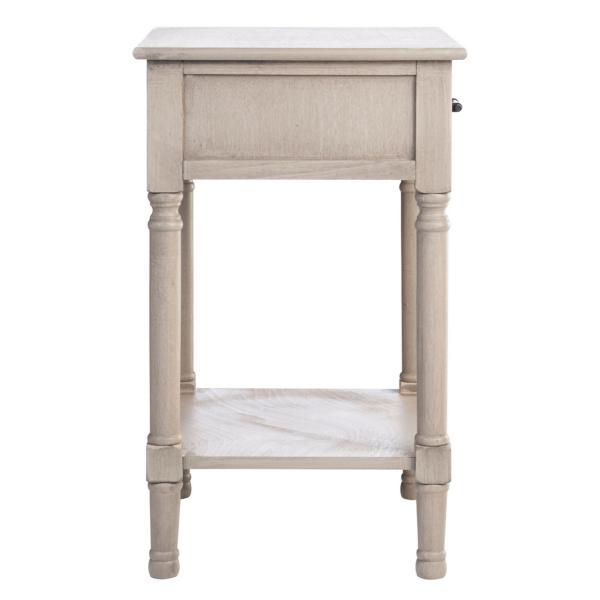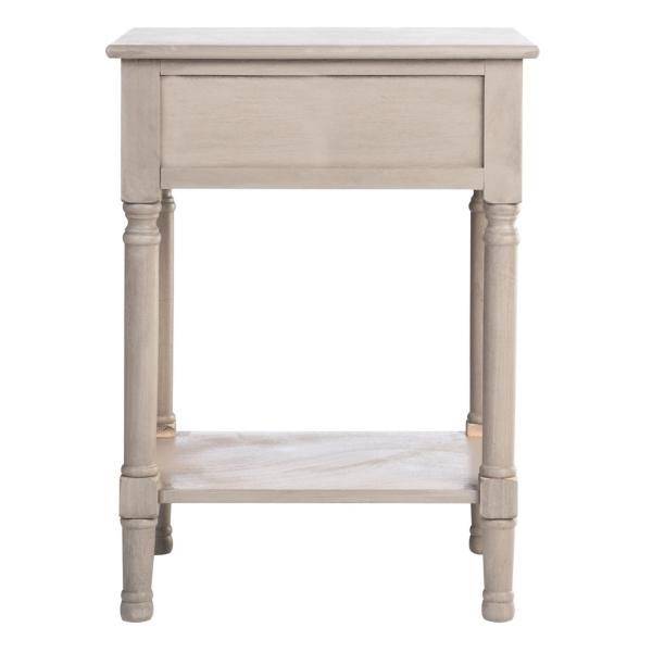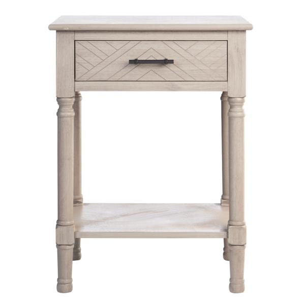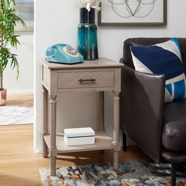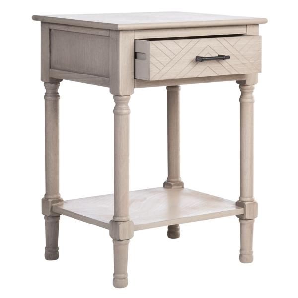Understated yet sophisticated, this Greige Wood Peyton 1-Drawer End Table is ideal for today’s classic contemporary décor! Timeless turned legs and carved wooden accents get a modern touch with its herringbone pattern drawer. End table measures 19W x 15.8D x 26H in. Crafted of pine wood and MDF Greige finish Features one (1) drawer and one (1) lower shelf Accented with a herringbone pattern on drawer Antique black metal drawer pull Drawer measures 13.3W x 10.2D x 3.6H in. Shelf measures 14.3W x 11.2D x 12.4H in. Weight: 17.6 lbs. Weight capacity: 40 lbs. Assembly required; see Info & Guides in the drop down below to view or print assembly info Not intended for commercial use Care: Wipe with a soft, dry cloth. This item is available at Kirklands.com only, not available in stores. Please note: this item cannot be shipped to APO/FPO addresses.