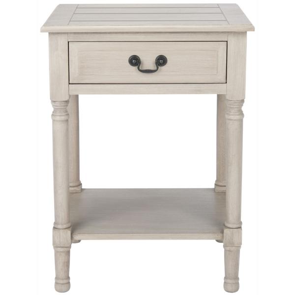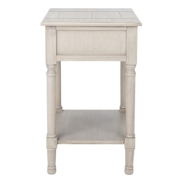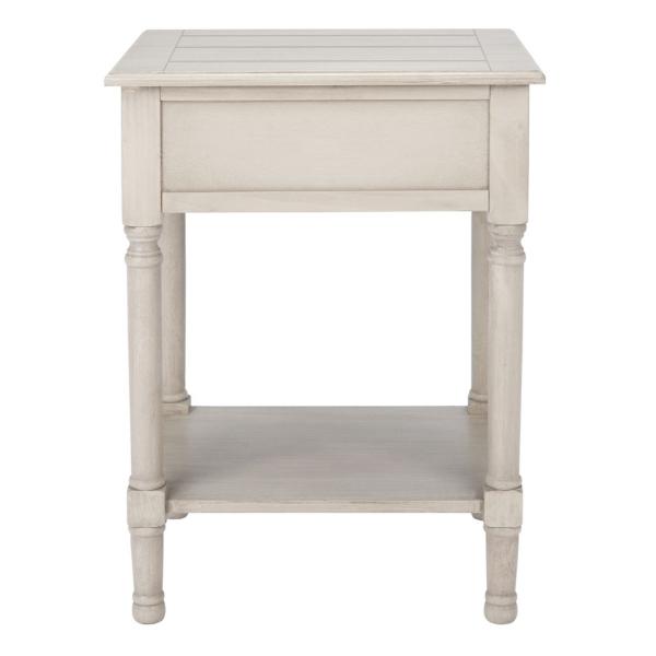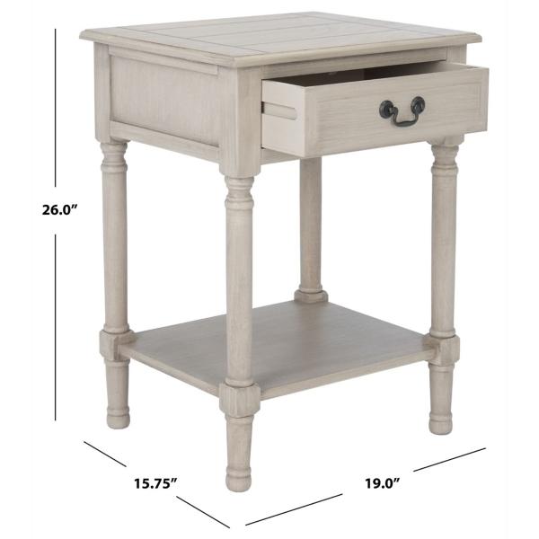 This Greige Wood Whitney 1-Drawer End Table emanates farmhouse charm! Its carved details bring rich depth while the open bottom shelf and drawer provide ample display and storage space. End table measures 19W x 15.8D x 26H in. Crafted of pine wood and MDF Greige finish Features one (1) drawer and one (1) lower shelf Accented with a wood slat design on tabletop Antique black metal drawer pull Drawer measures 13.3W x 10.2D x 3.6H in. Shelf measures 14.3W x 11.2D x 12.4H in. Weight: 17.6 lbs. Weight capacity: 40 lbs. Assembly required; see Info & Guides in the drop down below to view or print assembly info Not intended for commercial use Care: Wipe with a soft, dry cloth. This item is available at Kirklands.com only, not available in stores. Please note: this item cannot be shipped to APO/FPO addresses.