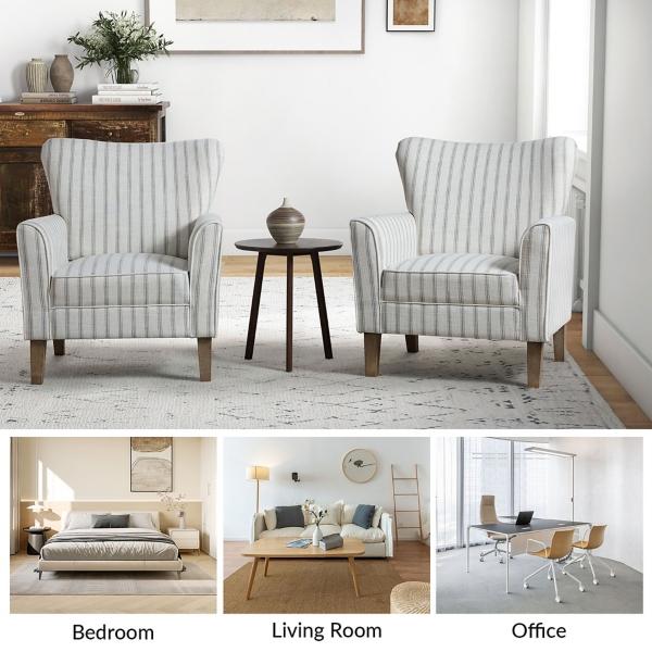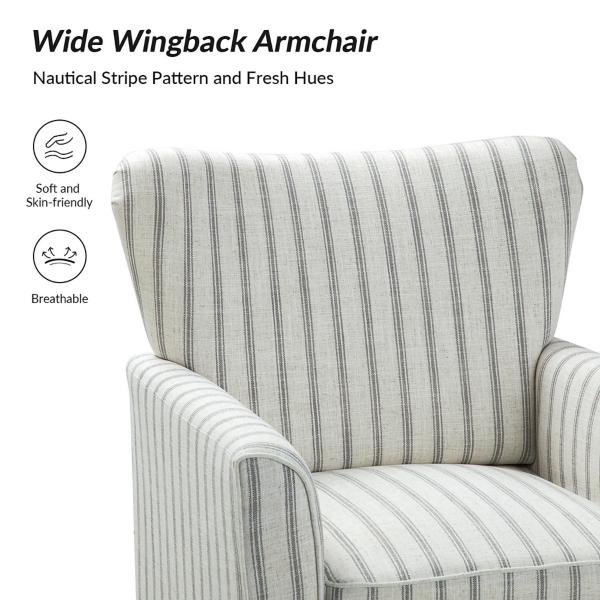 Refresh your space with this coastal farmhouse-inspired Gustaf Gray Striped Armchair! You’ll love how this chair brings a light and airy look and feel to your home. Overall dimensions Width: 31 in. Depth: 33 in. Height: 36 in. Crafted of solid and manufactured wood Upholstered in polyester with high-density foam Brown leg finish Features a pinstripe fabric design Hues of ivory and gray Seat dimensions: 20.5W x 22D x 18.5H in. Weight: 39.36 lbs. Weight capacity: 250 lbs. Assembly required Not intended for commercial use Care: Spot clean. This item is available at Kirklands.com only, not available in stores. Please note: this item cannot be shipped to APO/FPO addresses.