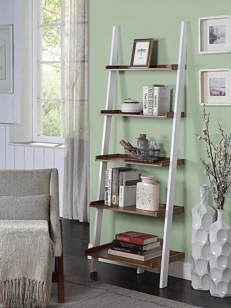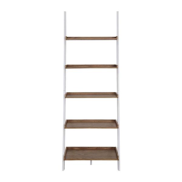 Elevate your interior with this Heritage White Wood Ladder Bookshelf, designed to blend style and function seamlessly. Five spacious shelves offer versatile storage and display options, perfect for showcasing books, framed photos, and decorative accents. Bookshelf measures 25W x 15.75D x 72.75H in. Crafted of solid pine, birch veneer, and MDF White frame finish and brown shelf finish Features five (5) tiers of shelving Leaning ladder design Weight: 24 lbs. Top shelf capacity: 17.64 lbs.; second and third shelf capacity: 33.07 lbs.; fourth and bottom capacity: 55.12 lbs. Assembly required Not intended for commercial use Care: Wipe with a soft, dry cloth. This item is available at Kirklands.com only, not available in stores. Please note: this item cannot be shipped to APO/FPO addresses.