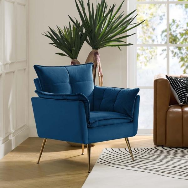 Make a bold statement with this Ilia Navy Velvet Accent Chair! The tufted backrest and armrests offer plush support, while the wide seat ensures a cozy and inviting experience. Chair measures 31.2W x 29D x 35H in. Crafted with a wood frame Upholstered in blue velvet and filled with high-density foam Gold metal leg finish Features a tufted cushion design Built-in s-spring Seat measures 19W x 18D x 18H in. Weight: 34 lbs. Weight capacity: 250 lbs. Assembly required Not intended for commercial use Care: Spot clean. This item is available at Kirklands.com only, not available in stores. Please note: this item cannot be shipped to APO/FPO addresses.
