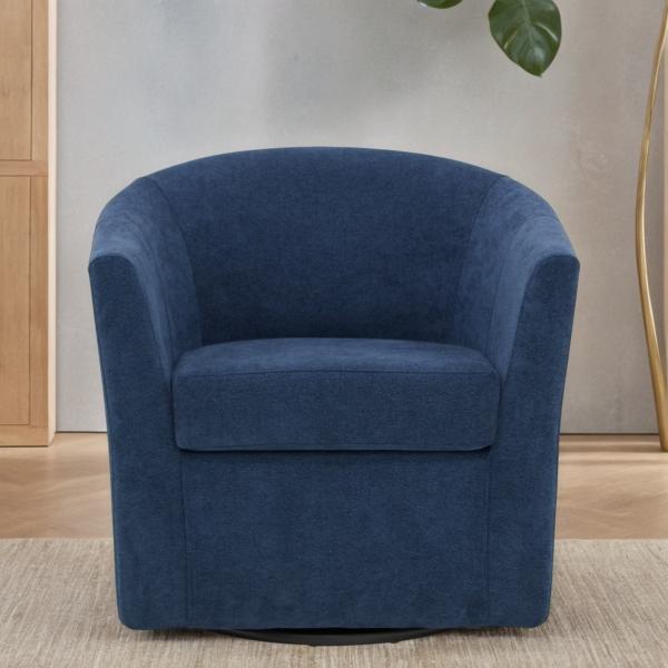 Enjoy both comfort and style with this Indigo Chloe Swivel Accent Chair! This chair features a classic club design with swivel ability. The barrel shape offers support so you can use this chair anywhere, from a reading nook to your living room! Chair measures 30W x 27D x 30H in. Crafted with a wood and metal frame Upholstered in polyester and filled with high-density foam Black base finish Blue upholstery finish Features 360 degree swivel capability Removable seat cushion Seat dimensions: 20W x 20D x 19H in. Weight: 34 lbs. Weight capacity: 300 lbs. Crafted with sustainable materials Assembly required Not intended for commercial use Made in the United States Care: Spot clean. This item is available at Kirklands.com only, not available in stores. Please note: this item cannot be shipped to APO/FPO addresses.
