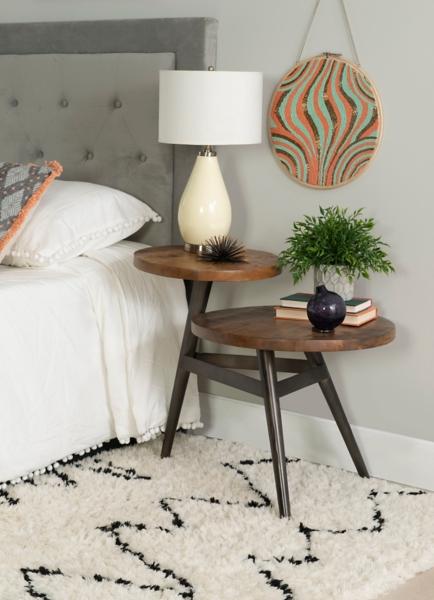 This Industrial Two-Tiered Gunmetal Accent Table makes the plant stand! You’ll love seeing cascading leaves contrast with this table’s modern design. Table measures 30L x 21W x 24H in. Upper self measures 16 in. in diameter Lower self measures 21 in. in diameter Crafted of iron and mango wood Natural brown wood finish with gray frame Features a round, two-tier shelf design Weight capacity: 35 lbs. No assembly required Not intended for commercial use Care: Wipe with a soft, damp cloth. This item is available at Kirklands.com only, not available in stores. Please note: this item cannot be shipped to APO/FPO addresses. WARNING: This product can expose you to chemicals including di-(2 ethl hexyl) phthalate which is known to the state of California to cause cancer and birth defects or other reproductive harm. For more information go to www.P65Warnings.ca.gov.
