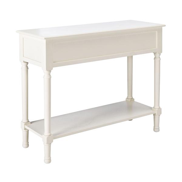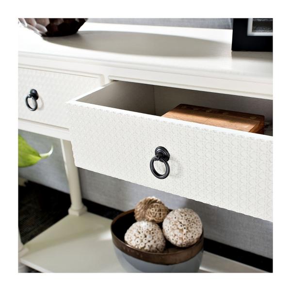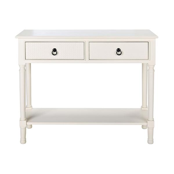 Revamp your foyer with an element of charm and class! Our Irma White Textured Drawers Console Table features a modern design that’ll look lovely in a contemporary home. Table measures 35.5L x 13W x 29.5H in. Crafted of wood White finish with black hardware Includes two (2) textured drawers and a bottom shelf Weight capacity: 40 lbs. Some assembly required Not intended for commercial use Care: Wipe with a soft, damp cloth. Pat dry. Use adhesive felt pads, coasters and placemats. Not safe for outdoor use. This item is available at Kirklands.com only, not available in stores. Please note: this item cannot be shipped to APO/FPO addresses. WARNING: This product can expose you to chemicals including wood dust which is known to the state of California to cause cancer and birth defects or other reproductive harm. For more information go to www.P65Warnings.ca.gov.