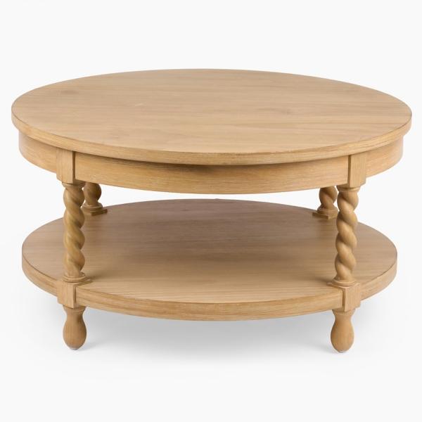 Bring classic charm and modern sophistication into your home with this Isabella Natural Wood Round Coffee Table! Its elegant twisted spindle legs lend a graceful, sculptural touch that elevates the overall design. Table measures 18H x 34 in. in diameter Crafted of rubberwood and pine MDF veneer Natural finish Features a lower shelf Spindle leg design Weight: 40 lbs. Assembly required Not intended for commercial use Care: Wipe with a soft, dry cloth. Contact your local Kirkland's store for availability. Quantities and selection may vary by location.