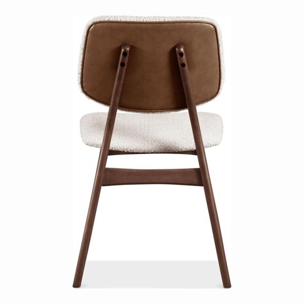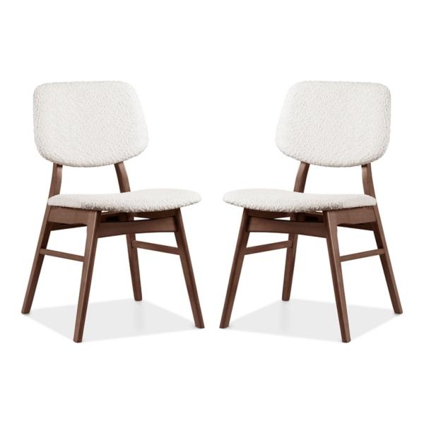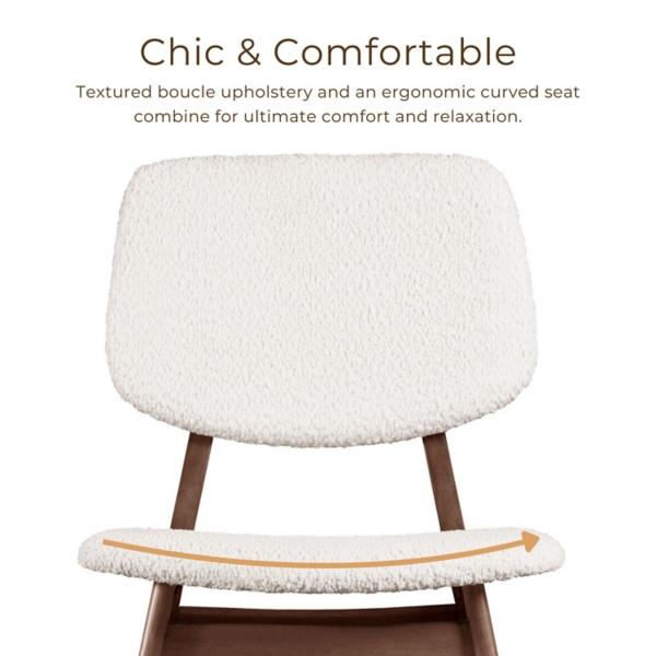 Upgrade your dining space with these Ivory Boucle Walnut Aspen Dining Chairs! These chairs feature cozy boucle upholstery and a stylish mid-century modern silhouette to make every meal comfortable and sophisticated. Set includes two (2) dining chairs Each chair measures 21W x 19D x 31.5H in.; seat height: 18 in. Crafted of solid wood Upholstered in ivory boucle fabric and filled with high-density foam Walnut wood finish Features ergonomic curved seats Faux leather back panel with welted trim Splayed legs Seat measures 18W x 15.25D in. Weight capacity: 250 lbs. Assembly required Not intended for commercial use Care: Spot clean. This item is available at Kirklands.com only, not available in stores. Please note: this item cannot be shipped to APO/FPO addresses.