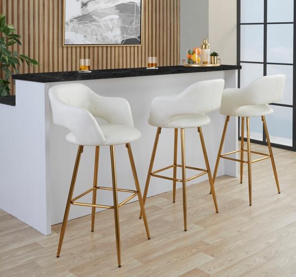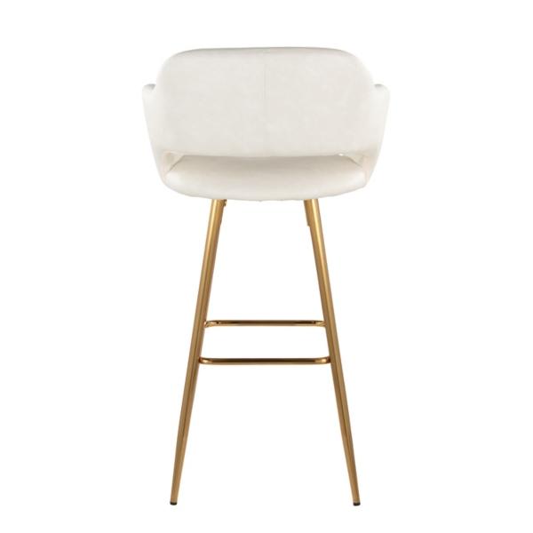 Upgrade your kitchen space with these Ivory Faux Leather Marge Bar Stools! These sleek stools feature sophisticated faux leather upholstery and contemporary silhouettes. They're perfect for elevating your home! Set includes two (2) bar stools Each stool measures 22W x 21.5D x 40.5H in.; seat height: 30 in. Crafted with a metal frame Upholstered in ivory faux leather with high-density foam Gold metal finish Features open, low backrests Slim armrests Built-in footrests Weight capacity: 250 lbs. Assembly required; see Info & Guides in the drop down below to view or print assembly instructions Not intended for commercial use Care: Wipe with a soft, damp cloth. This item is available at Kirklands.com only, not available in stores. Please note: this item cannot be shipped to APO/FPO addresses.