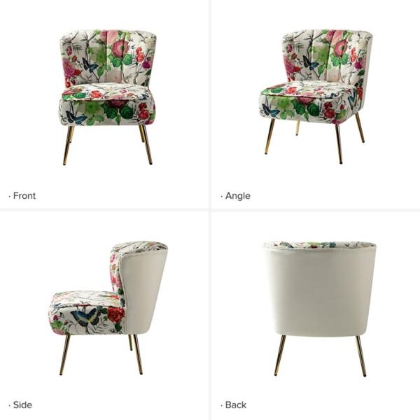 This Ivory Floral Amata Accent Chair features luxurious upholstery complemented by vertical tufting and a colorful floral pattern! It offers supreme comfort thanks to its ergonomic shape and durable frame with soft filling. Chair measures 26W x 30D x 31H in. Crafted with a wood frame and metal legs Upholstered in polyester and filled with high-density foam Gold metal leg finish Features a vertical tufted backrest Curved ergonomic shape Flower and butterfly fabric pattern Hues of ivory, pink, green, blue, yellow, and black Seat measures 22W x 21D x 18H in. Weight: 21 lbs. Weight capacity: 250 lbs. Assembly required Not intended for commercial use Care: Spot clean. This item is available at Kirklands.com only, not available in stores. Please note: this item cannot be shipped to APO/FPO addresses.