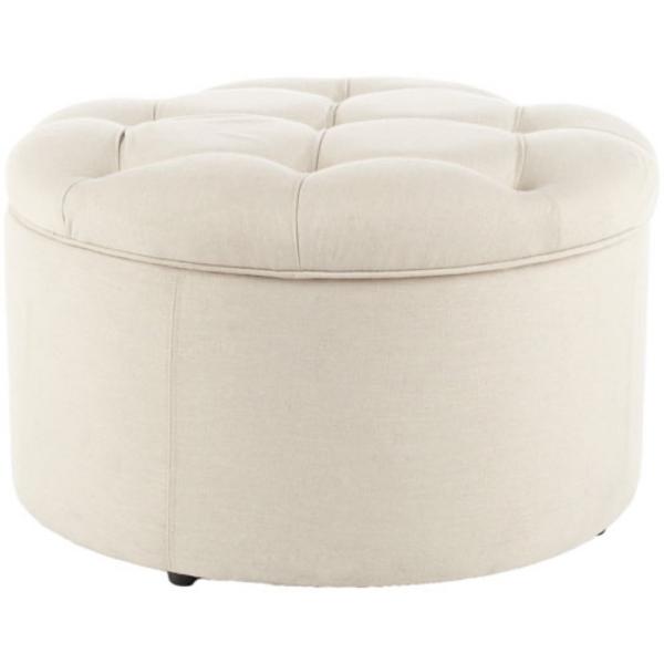 Especially designed to neatly store shoes, this Ivory Linen Tufted Shoe Storage Ottoman has room for purses, belts, and more. Crafted of wood and off-white linen-blend fabric, its interior is lined with a garden print. Ottoman measures 16.5H x 27.8 in. in diameter Crafted with a wood frame Upholstered in ivory linen blend fabric and filled with high-density foam Features interior shoe storage space Tufted fabric design Weight: 28 lbs. Weight capacity: 250 lbs. No assembly required Not intended for commercial use Care: Wipe with a soft, dry cloth. This item is available at Kirklands.com only, not available in stores. Please note: this item cannot be shipped to APO/FPO addresses.